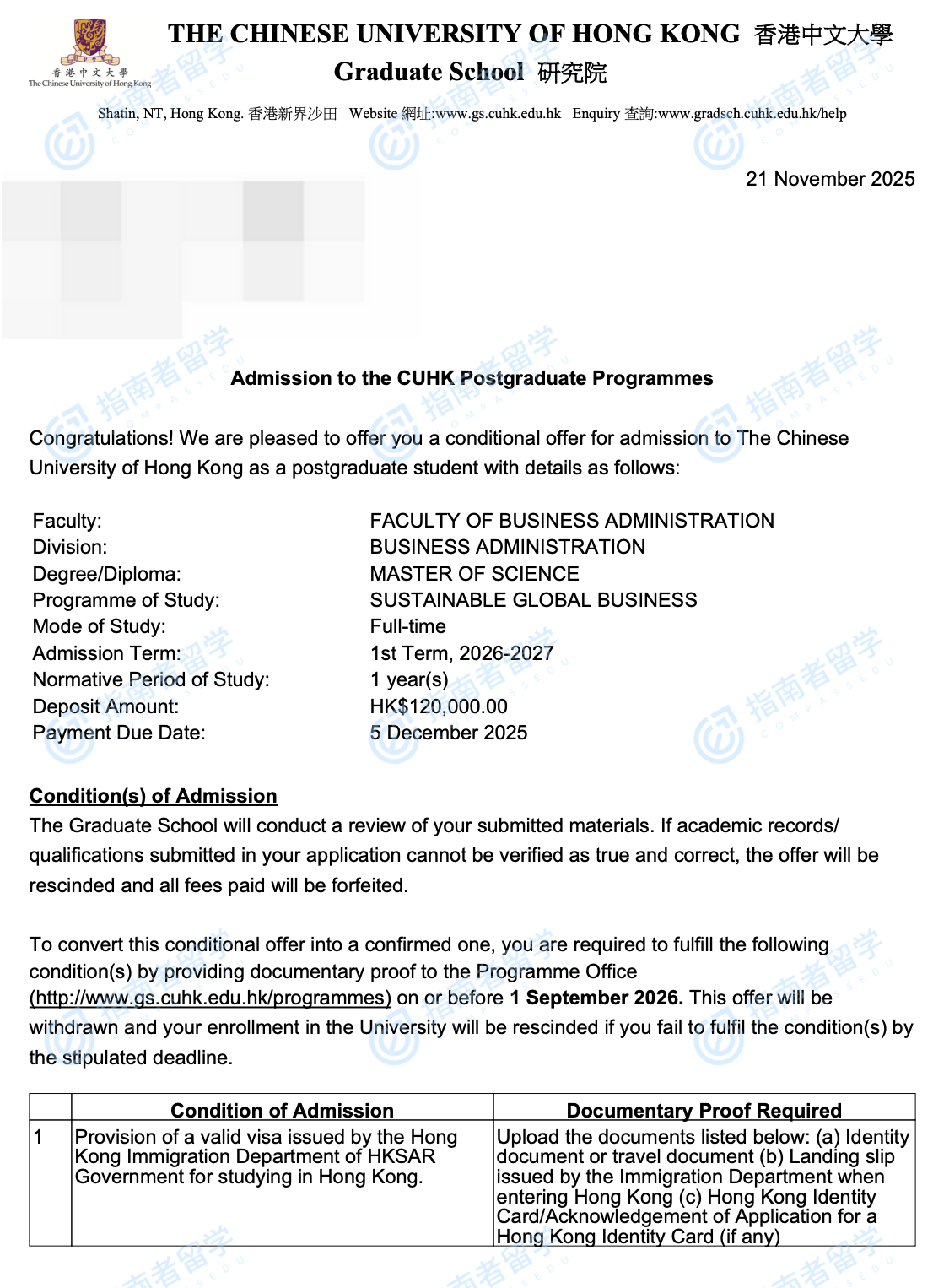 香港中文大學(xué)可持續(xù)環(huán)球商業(yè)理學(xué)碩士研究生offer一枚