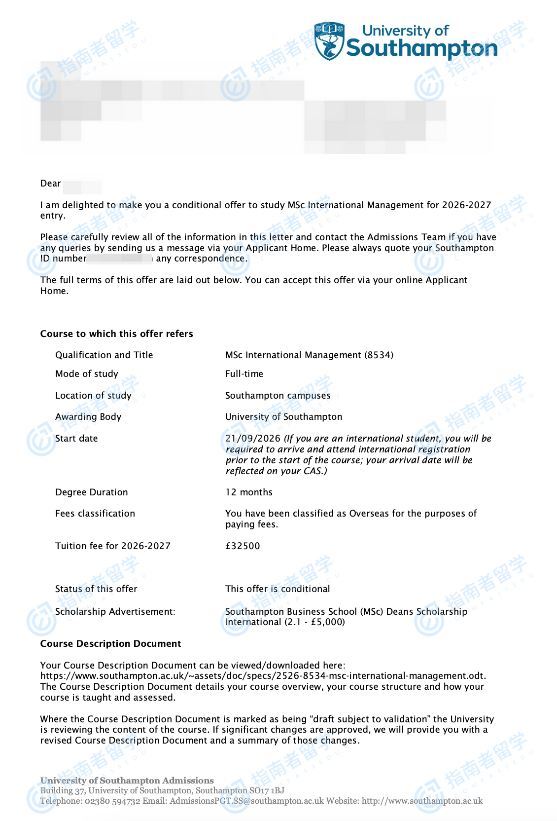 南安普頓大學(xué)國際管理理學(xué)碩士研究生offer一枚