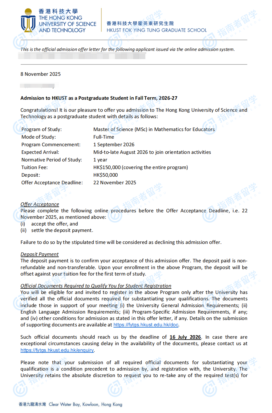 香港科技大學(xué)數(shù)學(xué)教育學(xué)理學(xué)碩士研究生offer一枚