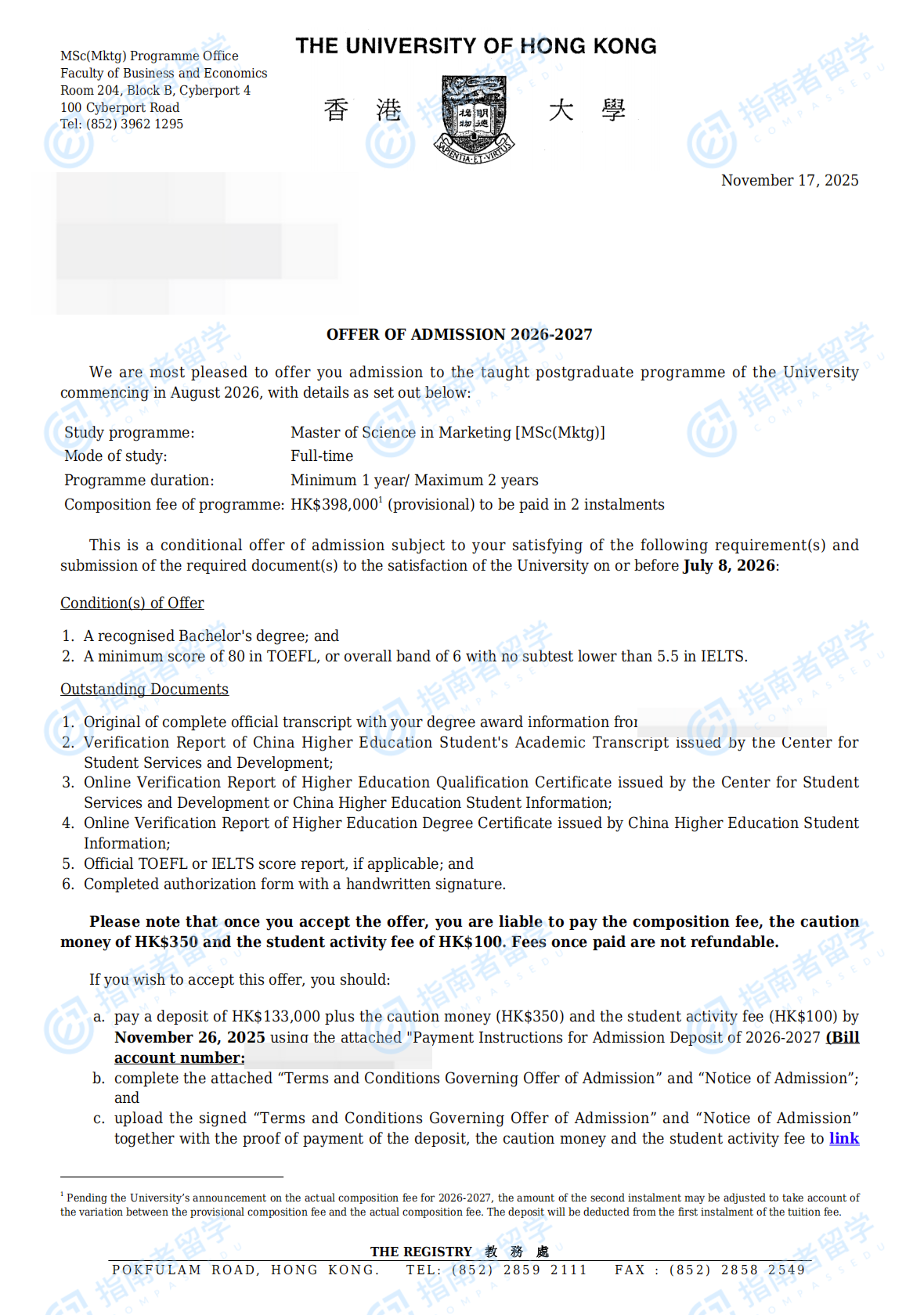 香港大學(xué)市場(chǎng)營(yíng)銷學(xué)理學(xué)碩士研究生offer一枚