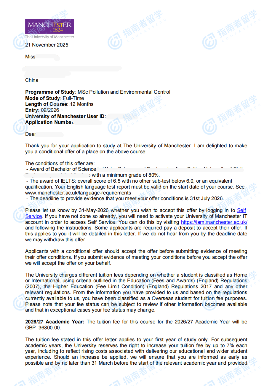 曼徹斯特大學(xué)污染與環(huán)境控制理學(xué)碩士研究生offer一枚