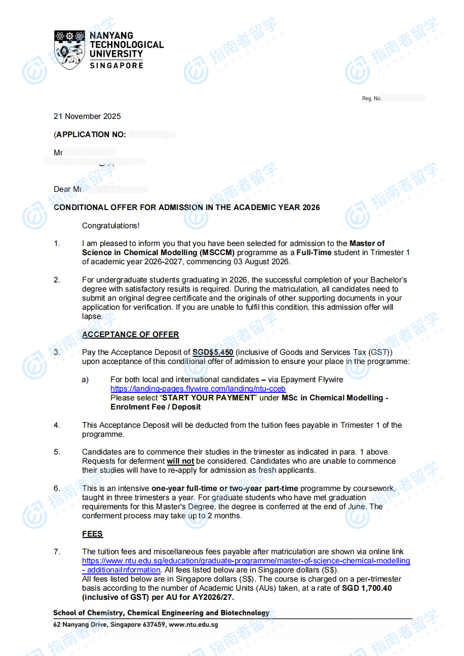 南洋理工大學化學建模理學碩士研究生offer一枚