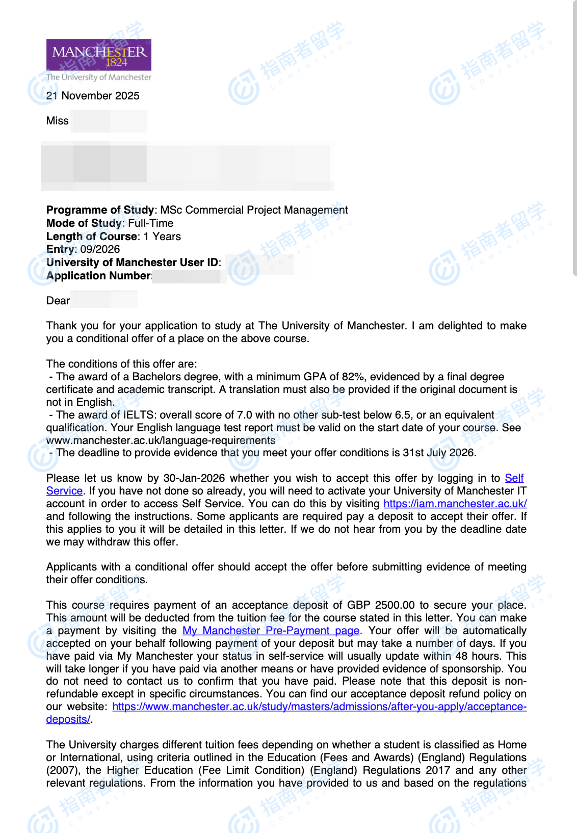 曼徹斯特大學(xué)商業(yè)項(xiàng)目管理理學(xué)碩士研究生offer一枚