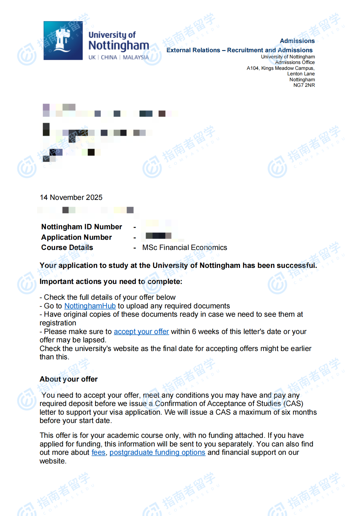 諾丁漢大學(xué)金融與投資理學(xué)碩士研究生offer一枚