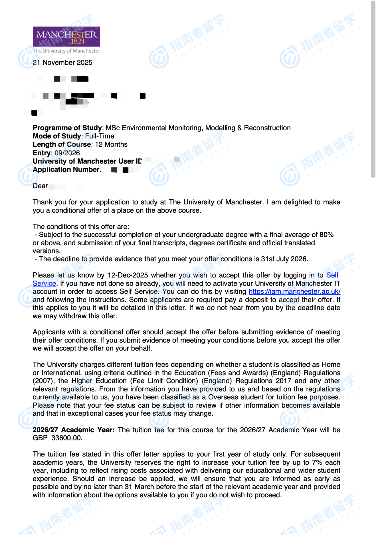 曼徹斯特大學(xué)環(huán)境監(jiān)測、建模與改造理學(xué)碩士研究生offer一枚