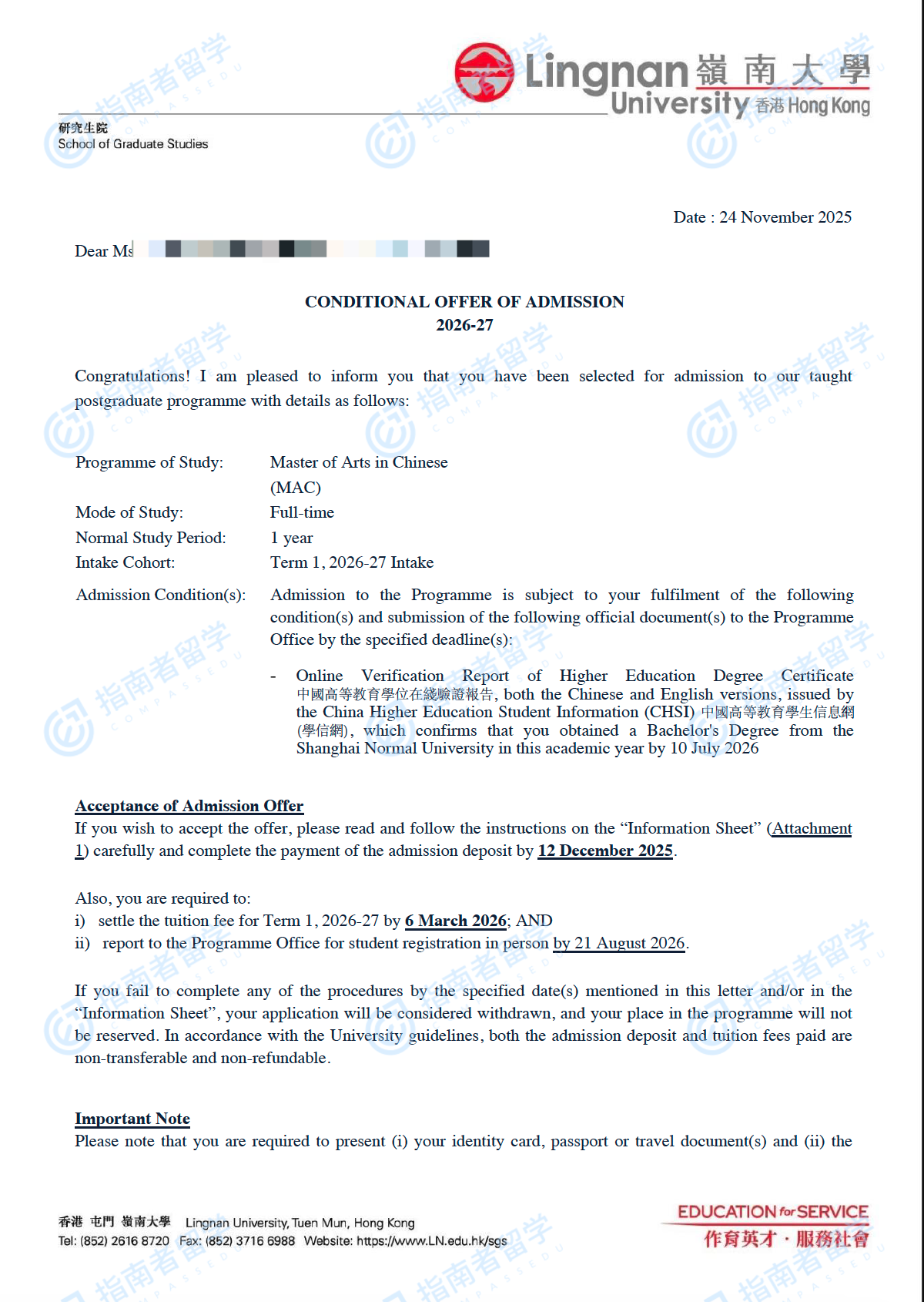 香港嶺南大學(xué)中文文學(xué)碩士研究生offer一枚