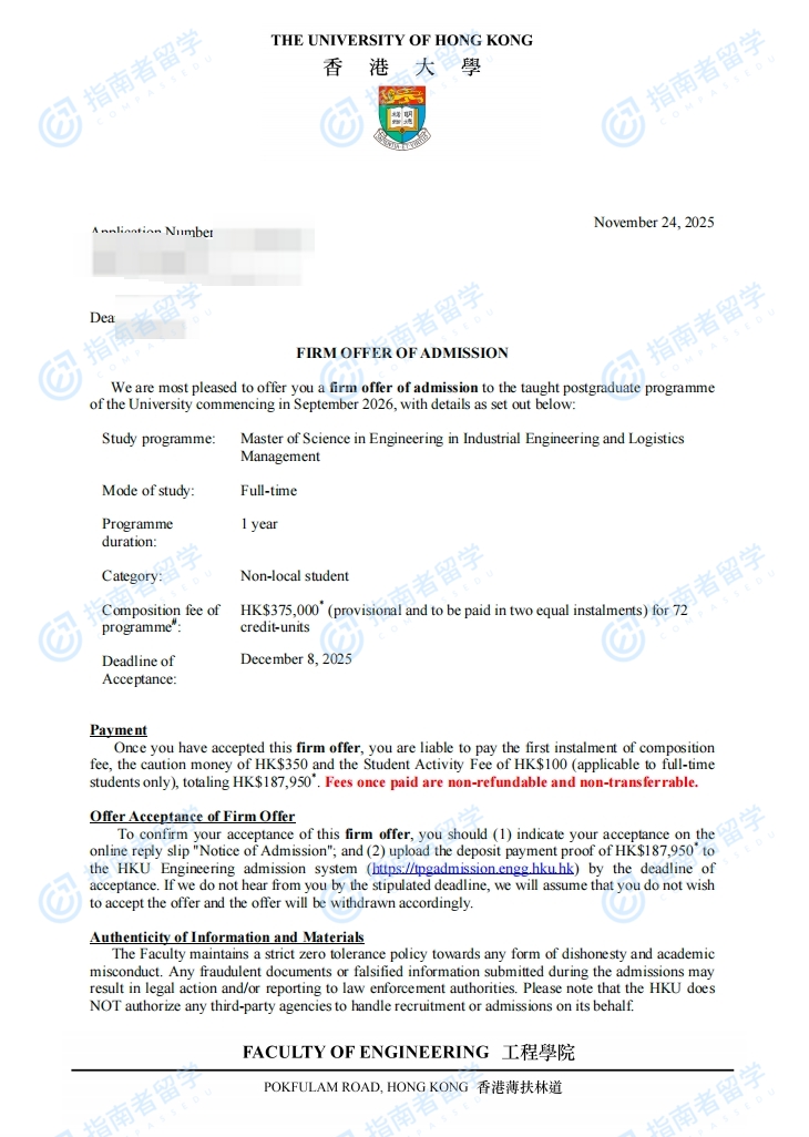 香港大學(xué)工業(yè)工程與物流管理(工程)理學(xué)碩士研究生offer一枚