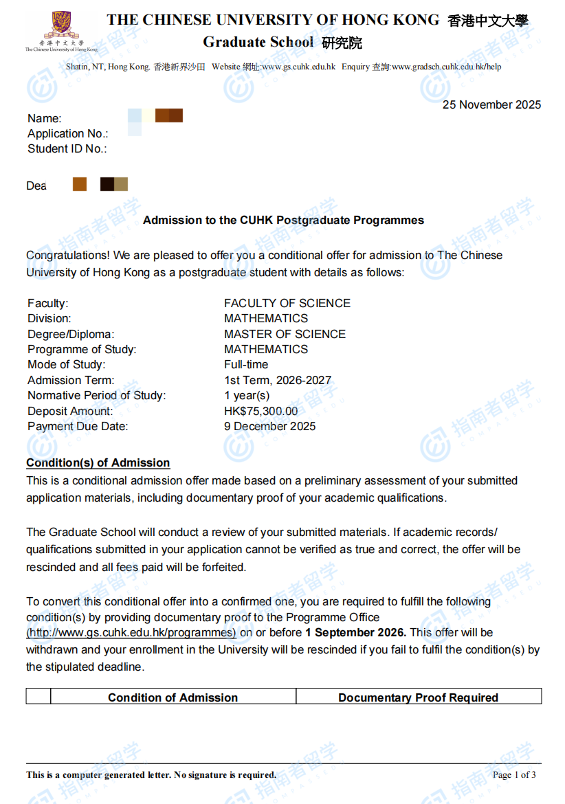 香港中文大學(xué)數(shù)學(xué)理學(xué)碩士研究生offer一枚