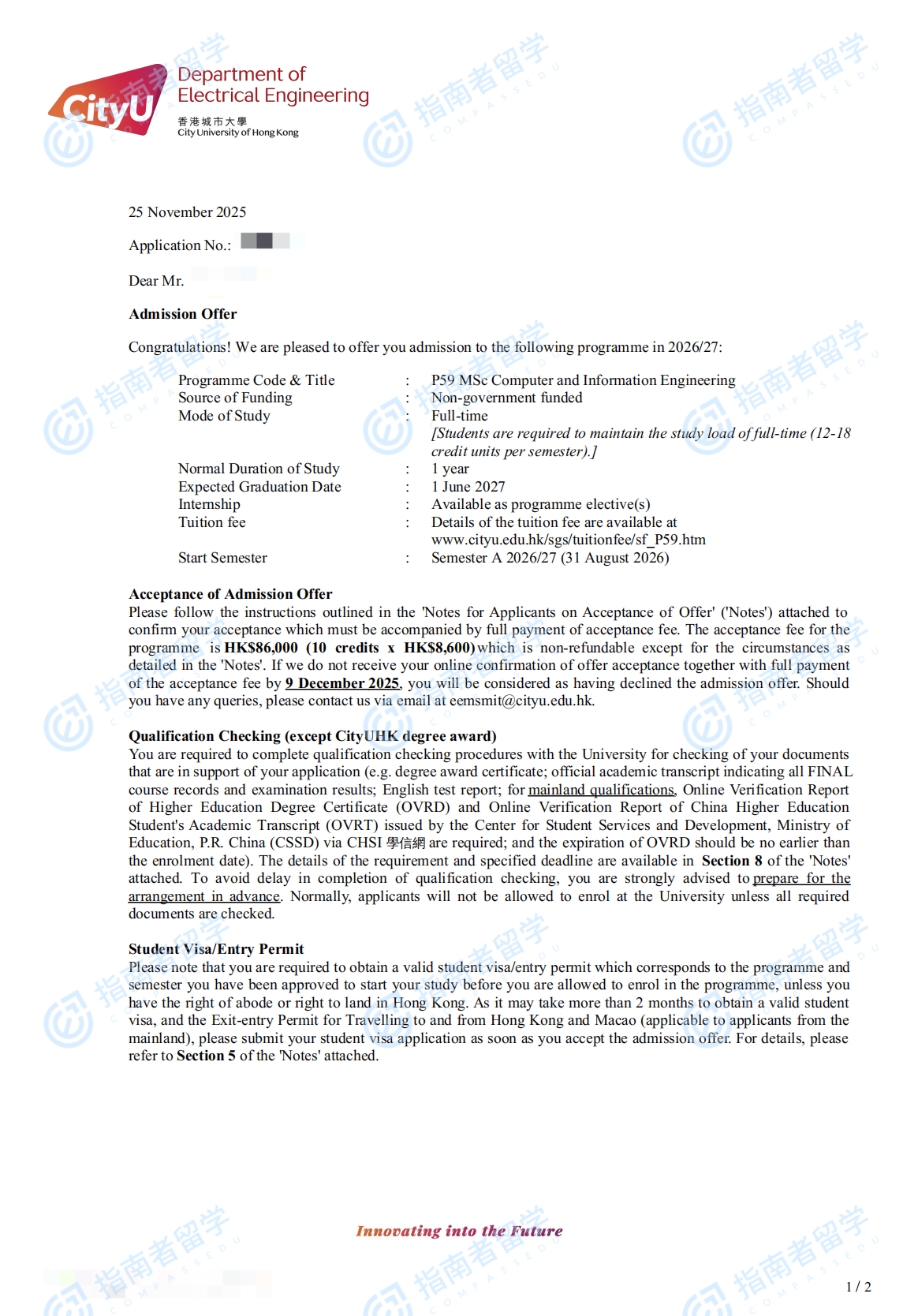 香港城市大學電子計算機與資訊工程理學碩士研究生offer一枚