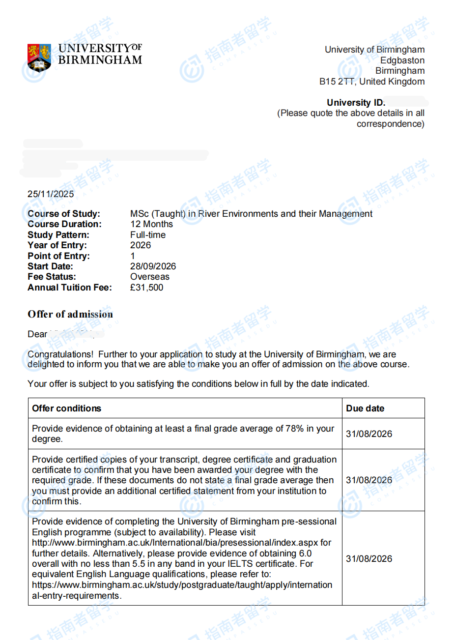 伯明翰大學河流環(huán)境及其管理理學碩士研究生offer一枚