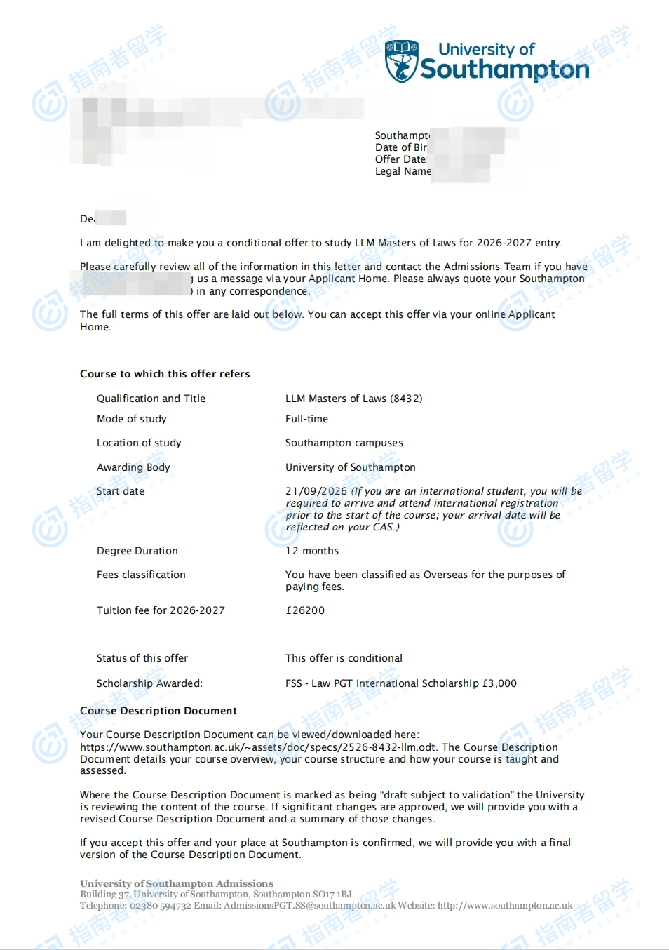 南安普頓大學(xué)法學(xué)碩士研究生offer一枚