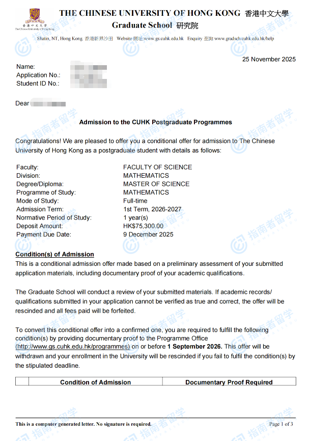 香港中文大學(xué)數(shù)學(xué)理學(xué)碩士研究生offer一枚