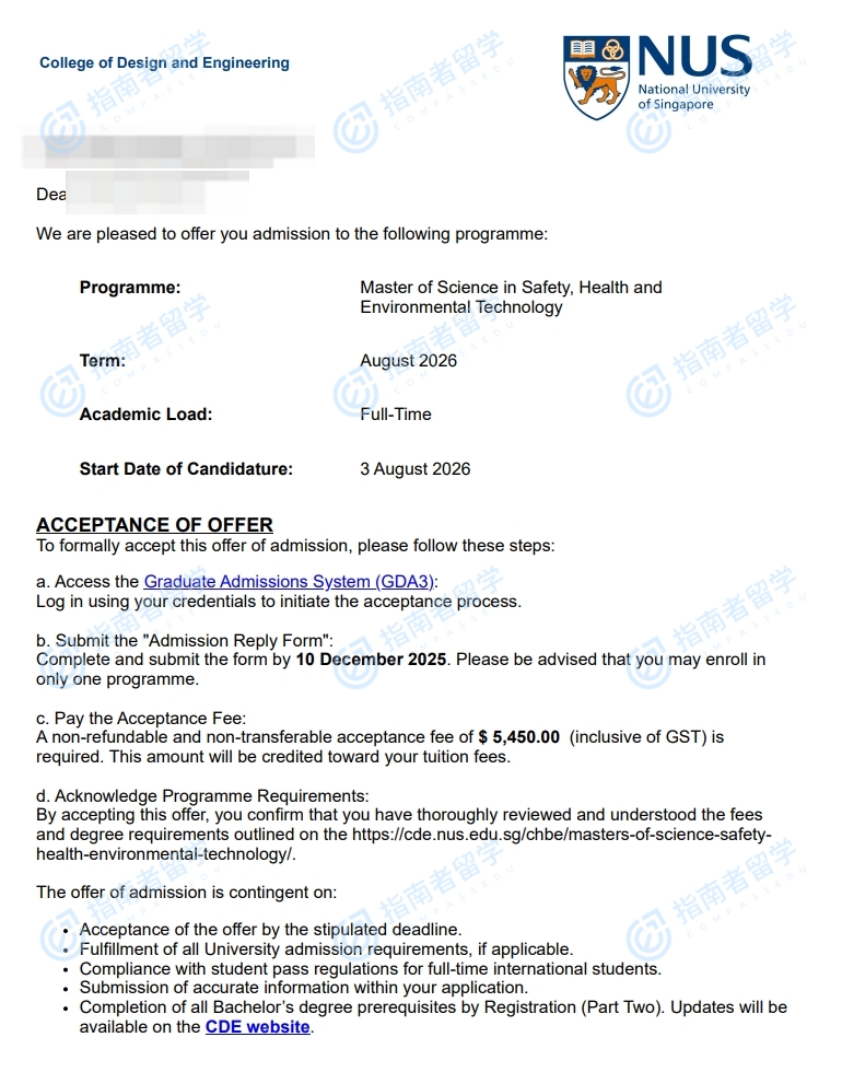 新加坡國立大學(xué)安全、健康與環(huán)境技術(shù)理學(xué)碩士研究生offer一枚