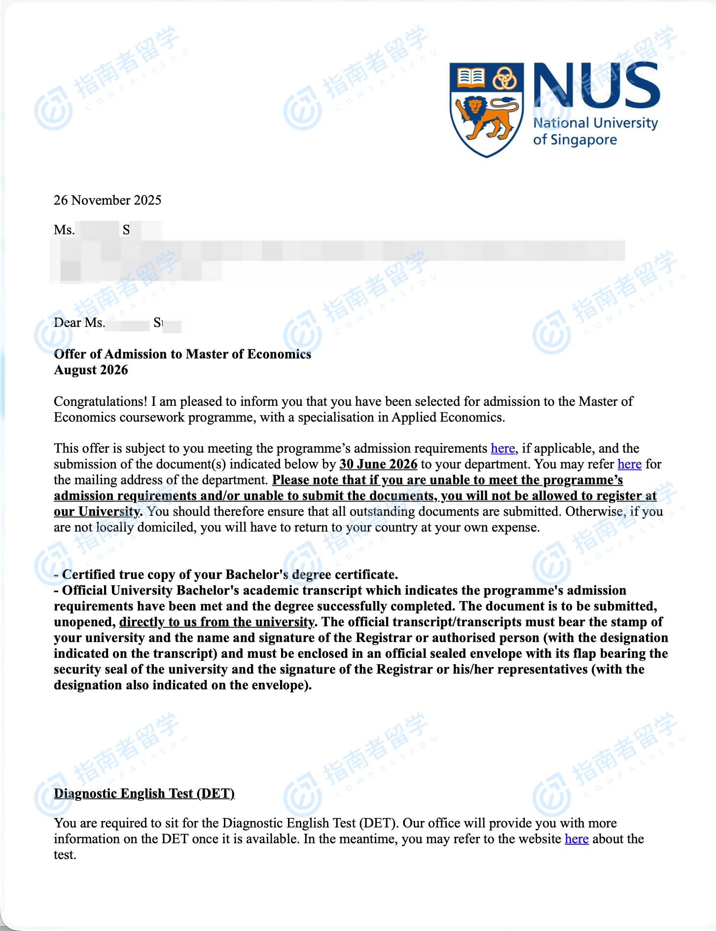 新加坡國立大學(xué)經(jīng)濟學(xué)碩士研究生offer一枚