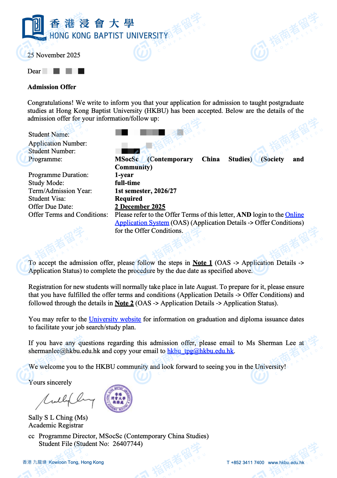 香港浸會(huì)大學(xué)當(dāng)代中國(guó)研究社會(huì)科學(xué)碩士研究生offer一枚