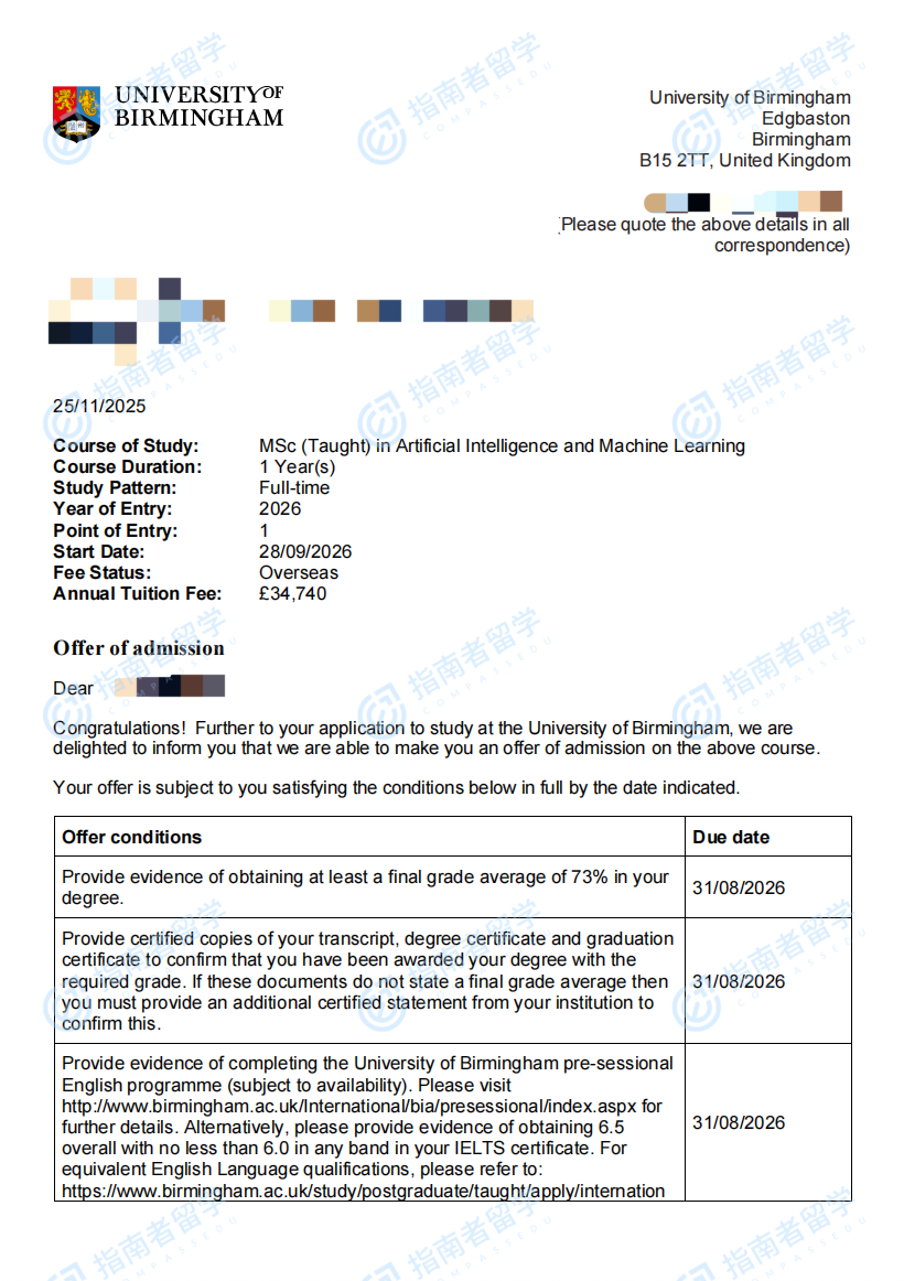 伯明翰大學(xué)人工智能與機器學(xué)習(xí)理學(xué)碩士研究生offer一枚