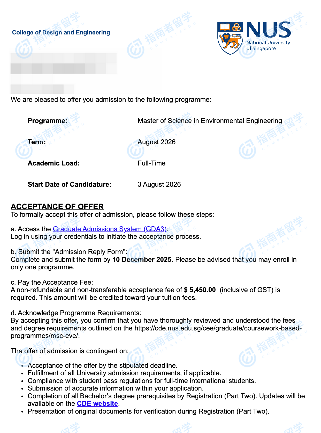 新加坡國(guó)立大學(xué)環(huán)境工程理學(xué)碩士研究生offer一枚