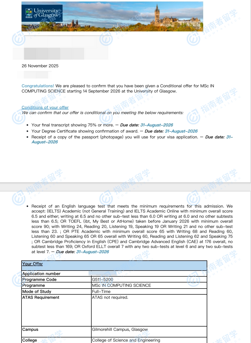 格拉斯哥大學(xué)計算科學(xué)理學(xué)碩士研究生offer一枚