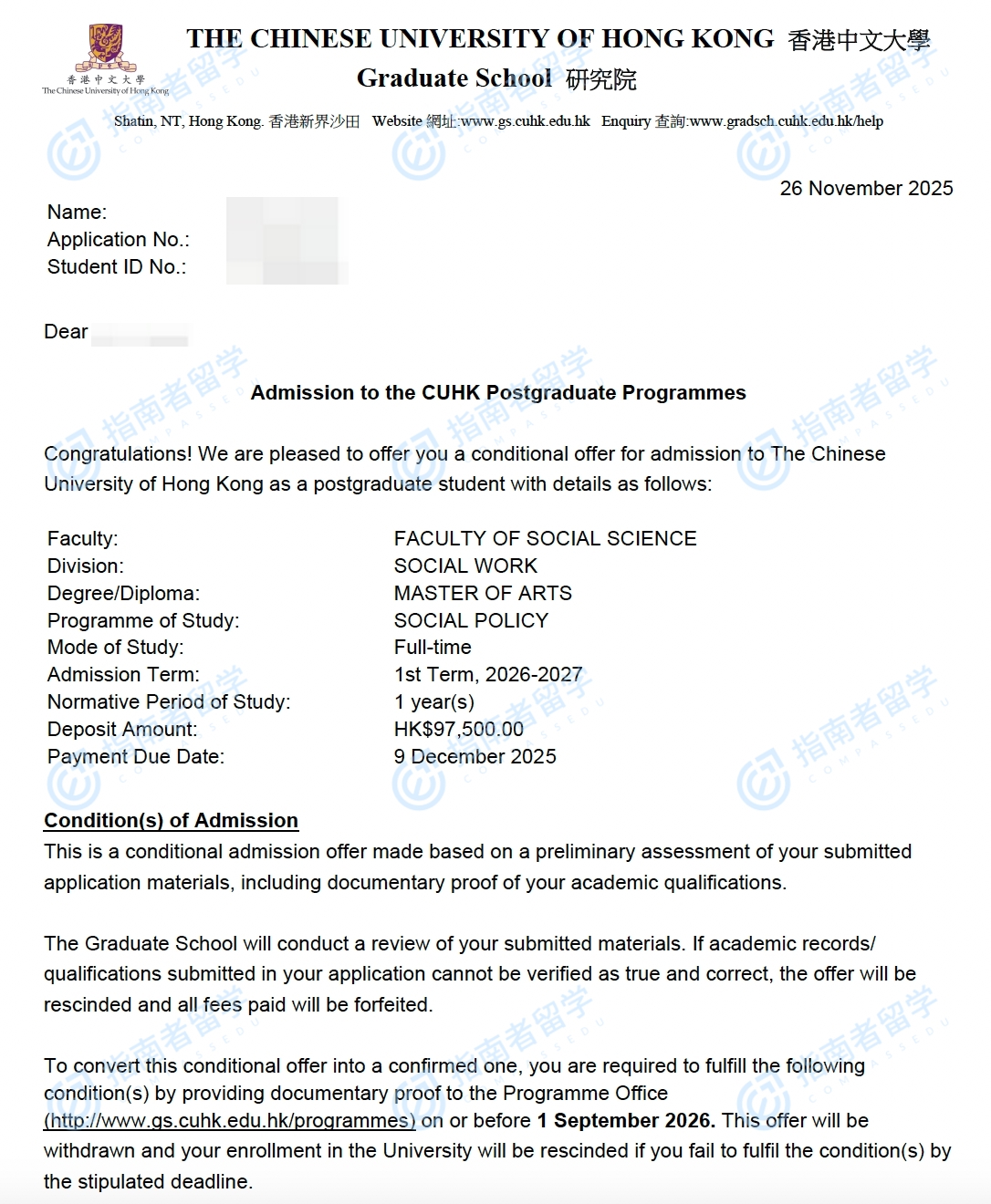 香港中文大學(xué)社會政策文學(xué)碩士研究生offer一枚