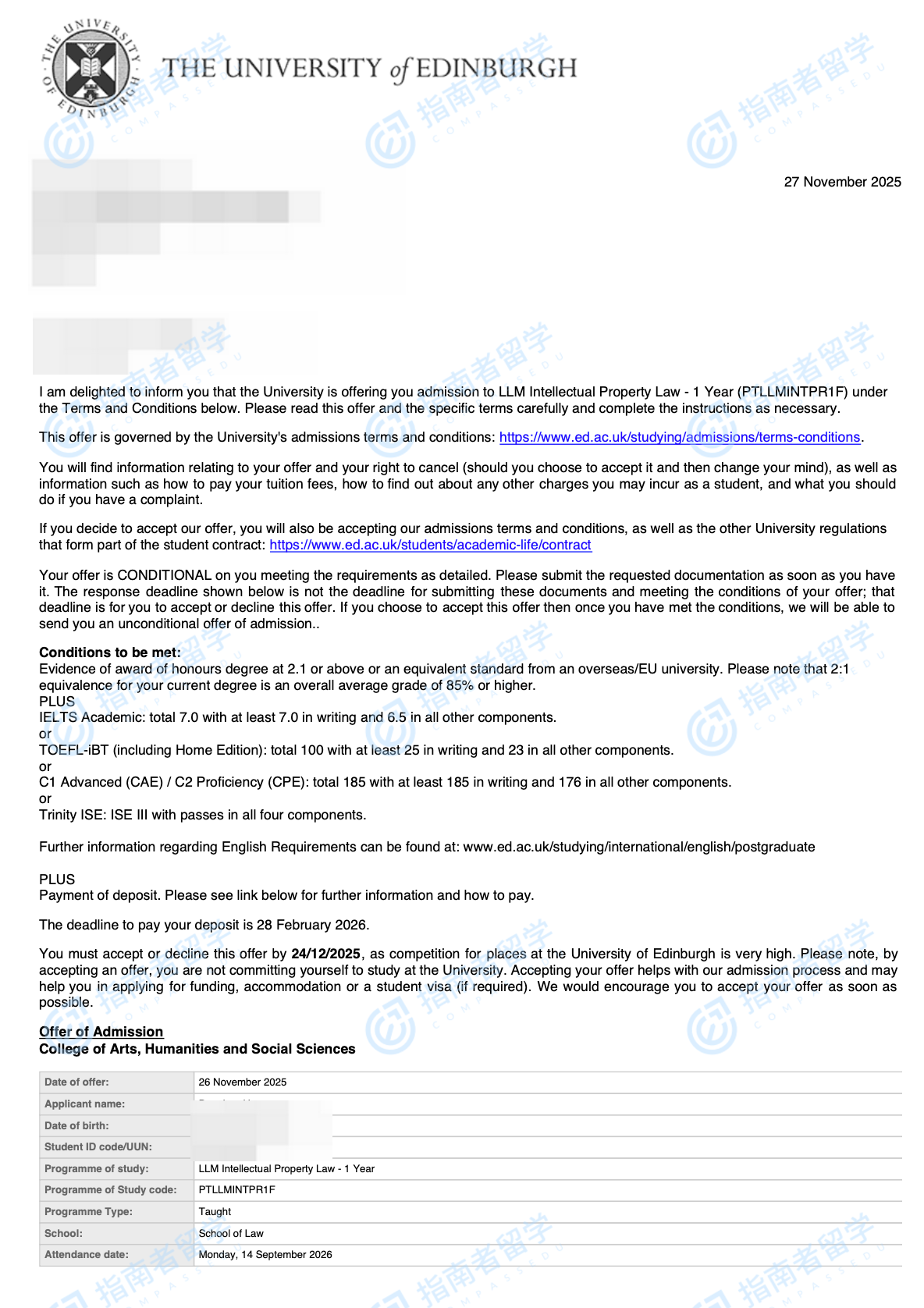 愛(ài)丁堡大學(xué)知識(shí)產(chǎn)權(quán)法法學(xué)碩士研究生offer一枚