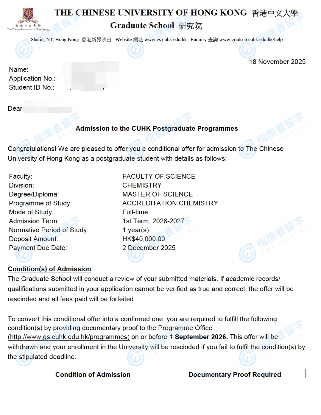 香港中文大學(xué)認(rèn)證化學(xué)理學(xué)碩士研究生offer一枚