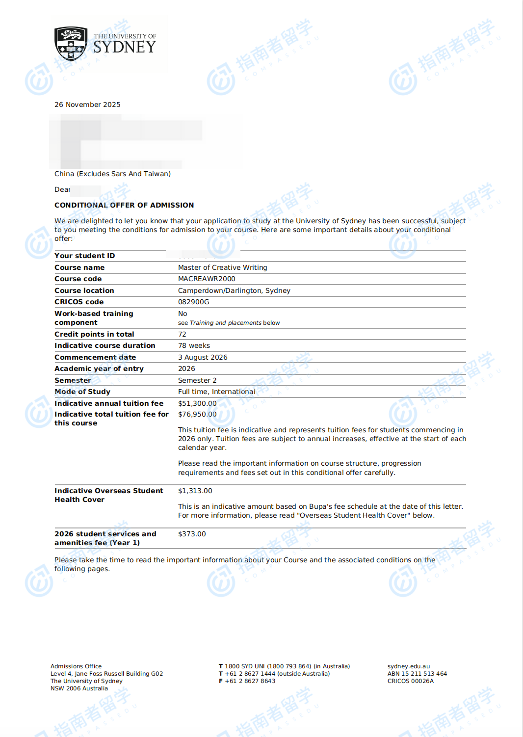悉尼大學(xué)創(chuàng)意寫(xiě)作碩士研究生offer一枚