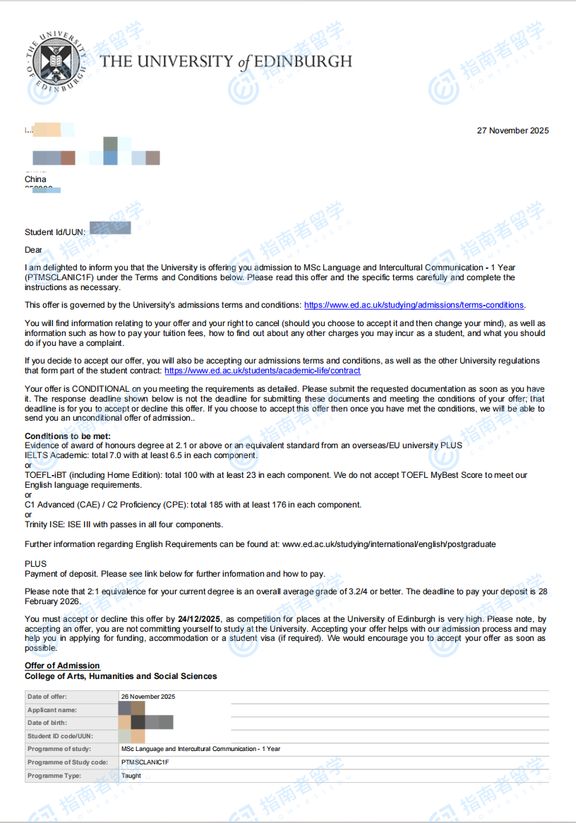 愛丁堡大學語言與跨文化交流理學碩士研究生offer一枚