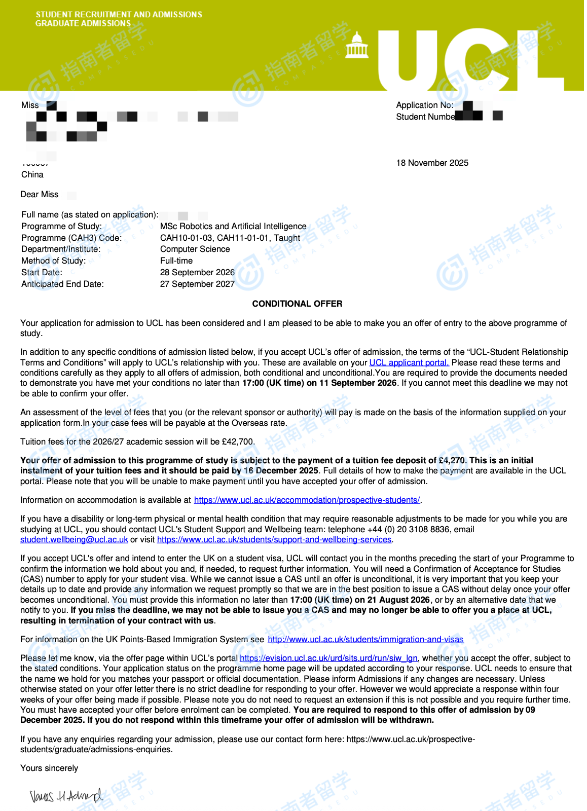 倫敦大學學院機器人與人工智能理學碩士研究生offer一枚