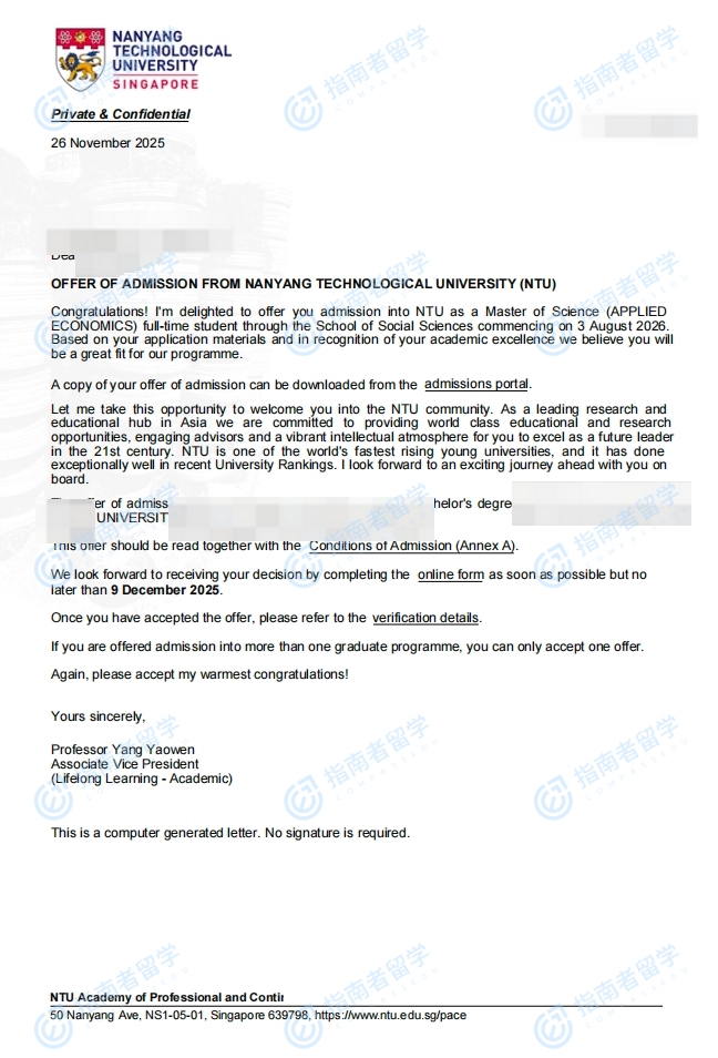 南洋理工大學應用經(jīng)濟學理學碩士研究生offer一枚