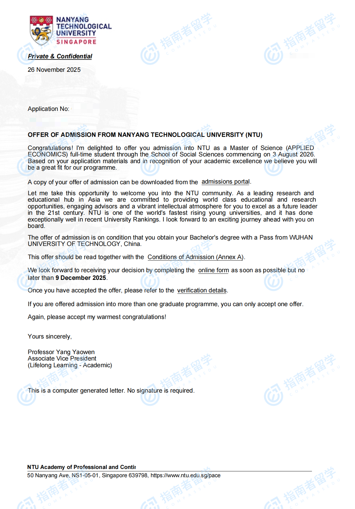 南洋理工大學應用經(jīng)濟學理學碩士研究生offer一枚