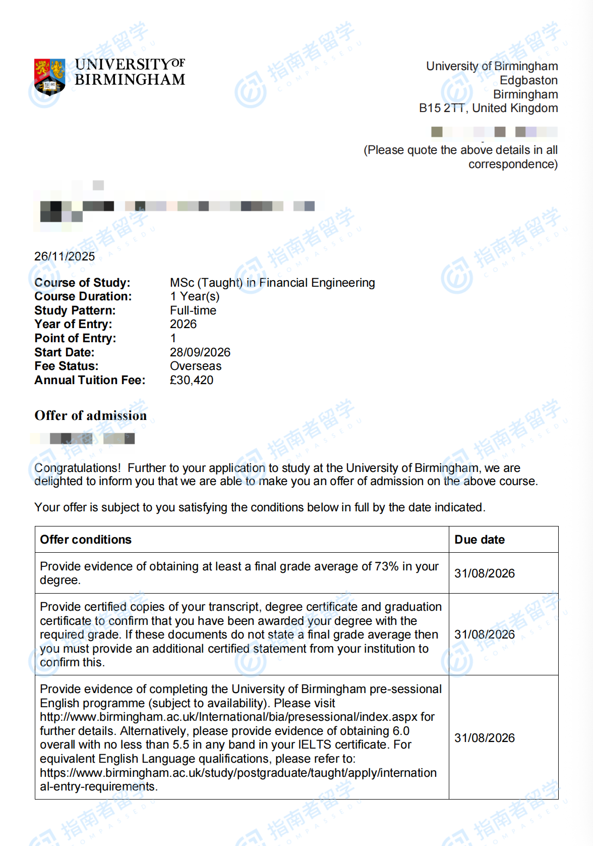 伯明翰大學(xué)金融工程理學(xué)碩士研究生offer一枚