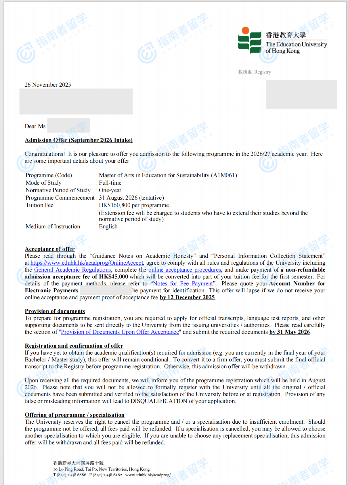 香港教育大學(xué)可持續(xù)發(fā)展教育文學(xué)碩士研究生offer一枚
