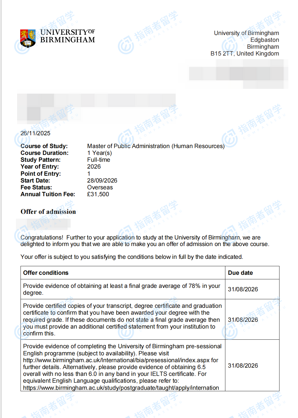 伯明翰大學(xué)公共管理碩士(人力資源)研究生offer一枚