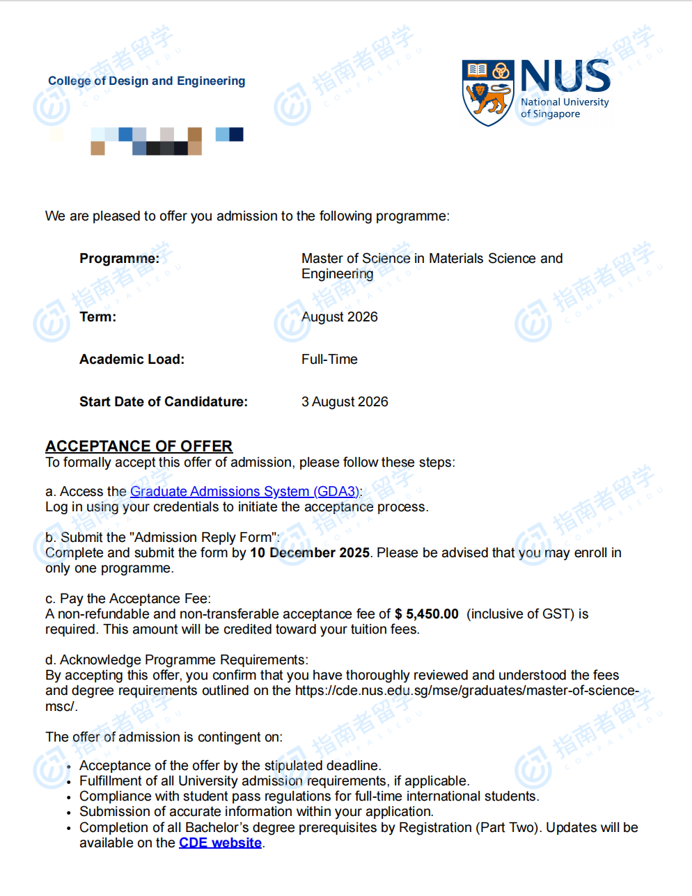 新加坡國立大學材料科學與工程理學碩士研究生offer一枚