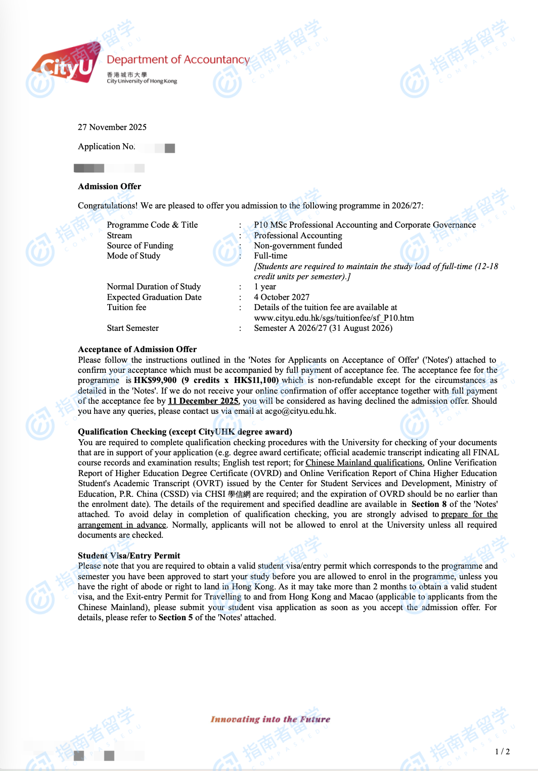香港城市大學(xué)專業(yè)會(huì)計(jì)與企業(yè)管治理學(xué)碩士研究生offer一枚