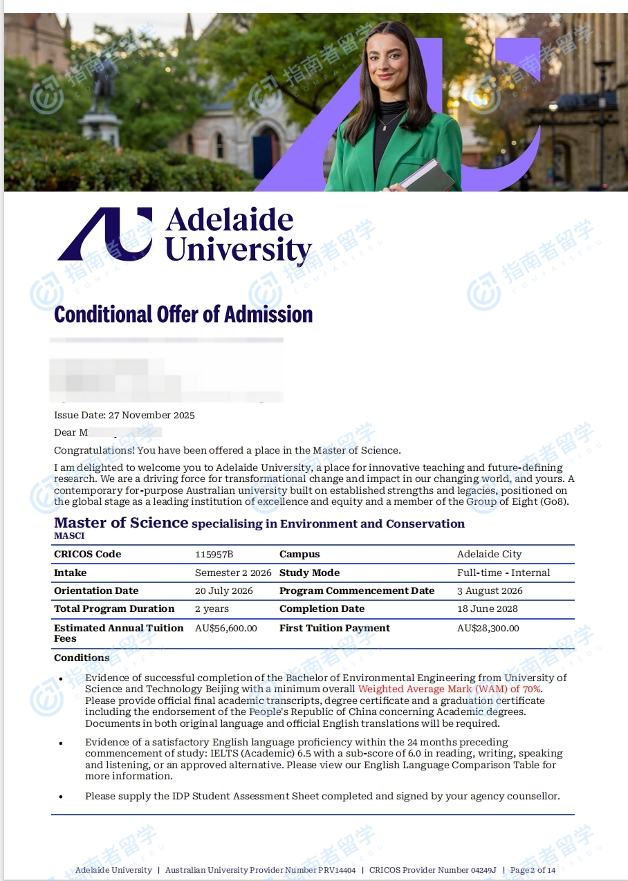 阿德萊德大學(xué)環(huán)境與保護(hù)理學(xué)碩士研究生offer一枚