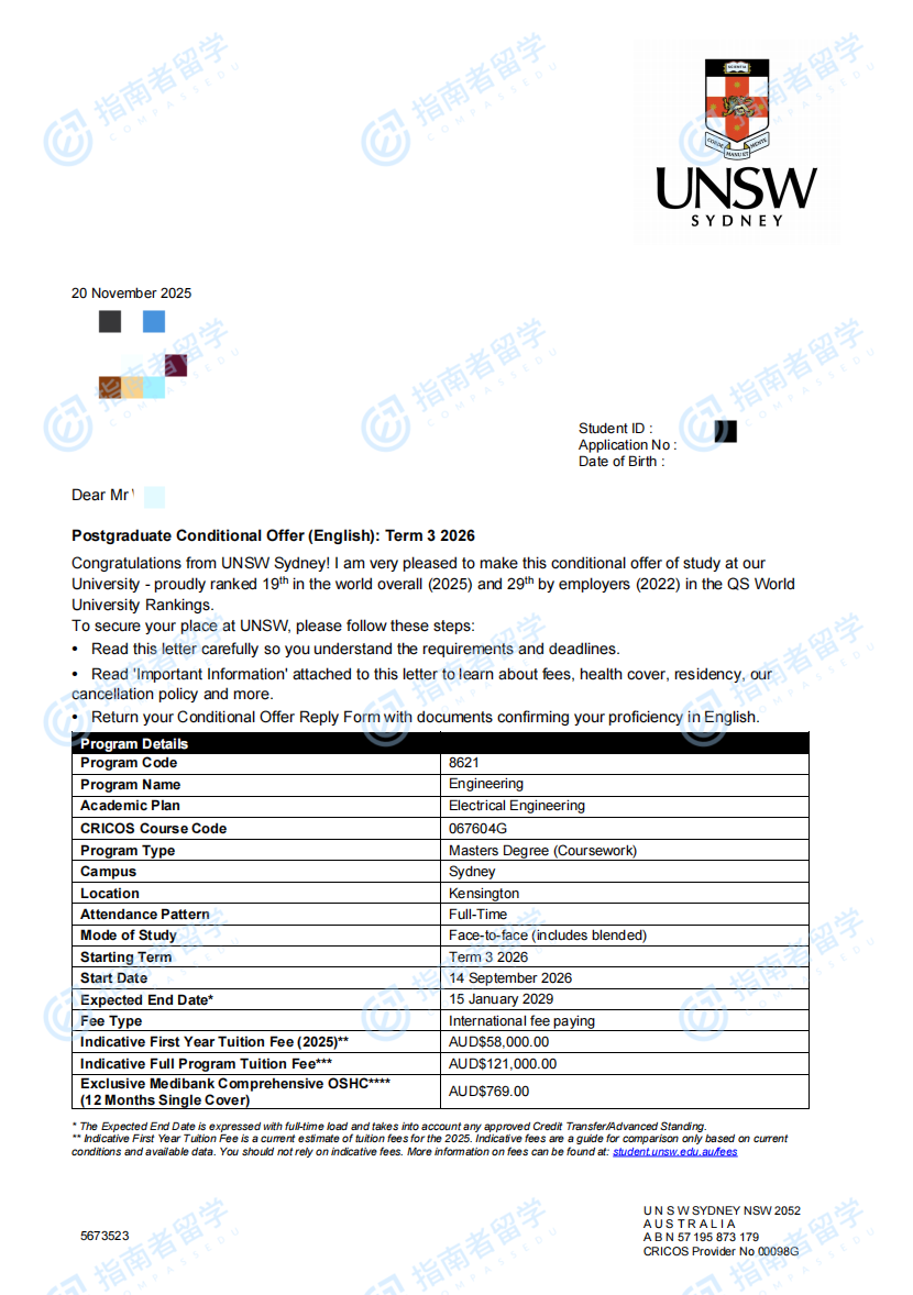 新南威爾士大學(xué)電氣工程工學(xué)碩士研究生offer一枚