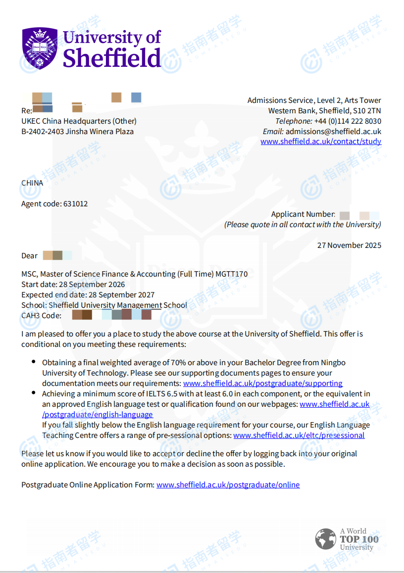 謝菲爾德大學(xué)金融與會計理學(xué)碩士研究生offer一枚