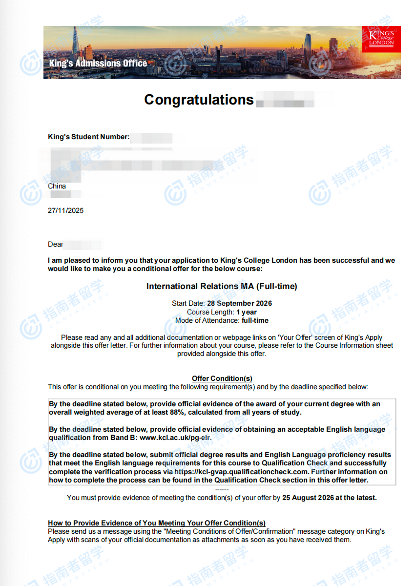 倫敦大學國王學院國際關系文學碩士研究生offer一枚