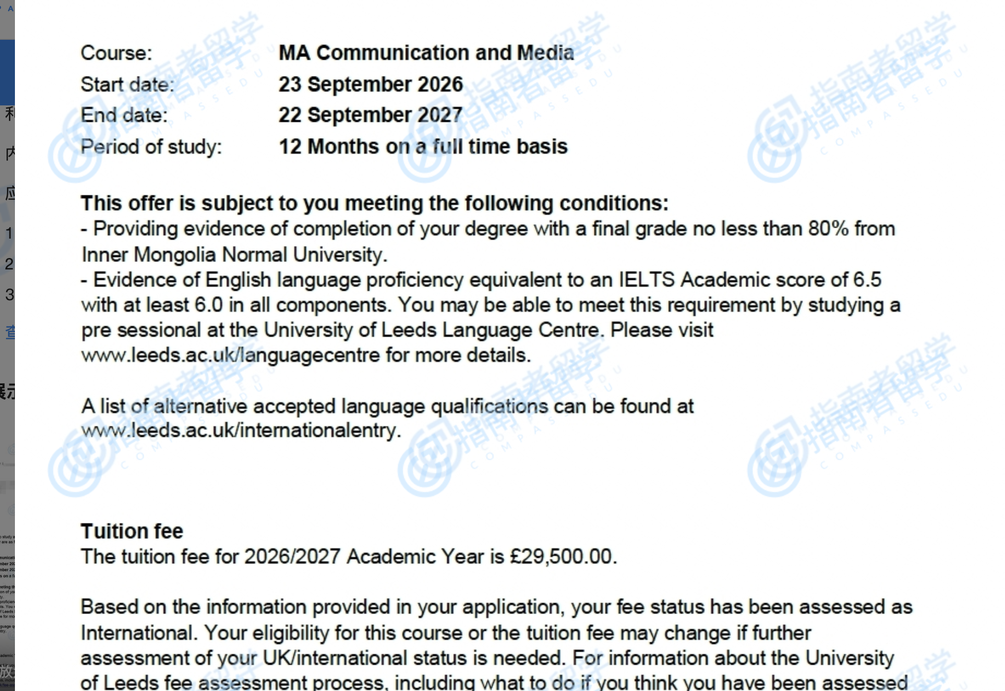 利茲大學傳播與媒體文學碩士研究生offer一枚