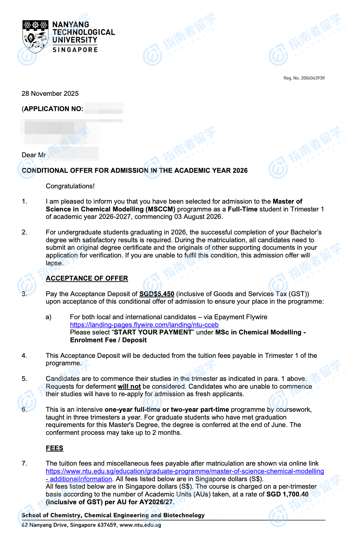 南洋理工大學(xué)化學(xué)建模理學(xué)碩士研究生offer一枚