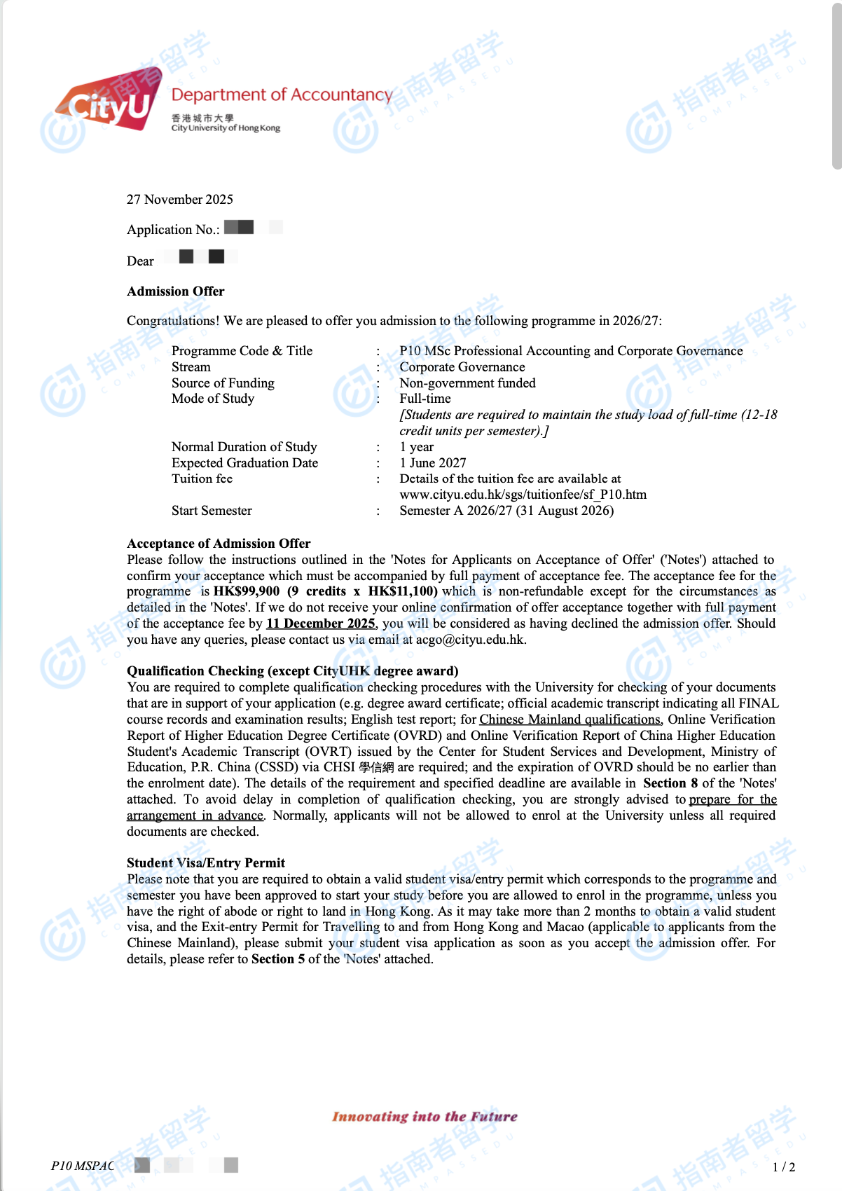 香港城市大學(xué)專(zhuān)業(yè)會(huì)計(jì)與企業(yè)管治理學(xué)碩士研究生offer一枚
