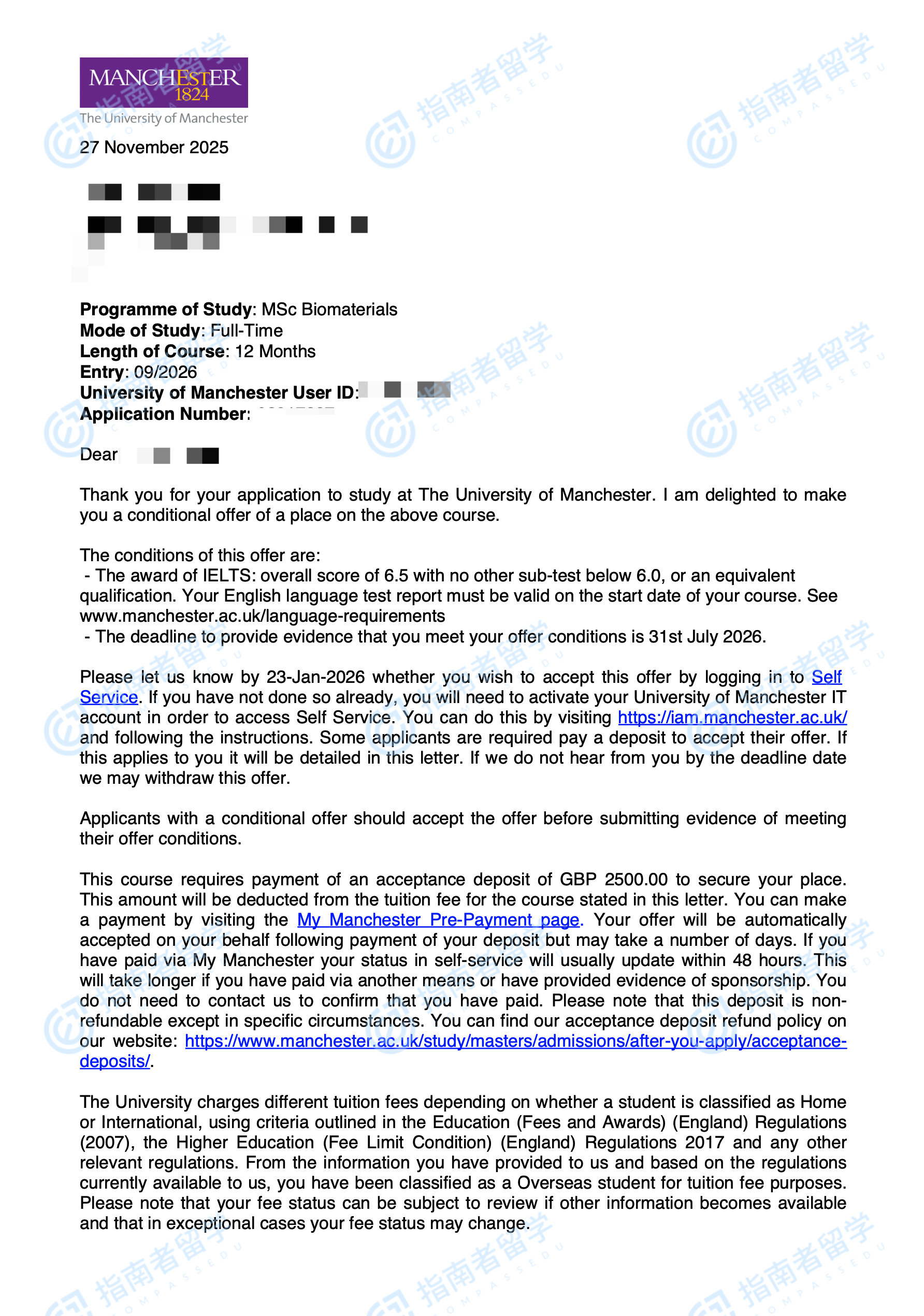 曼徹斯特大學(xué)生物材料學(xué)理學(xué)碩士研究生offer一枚