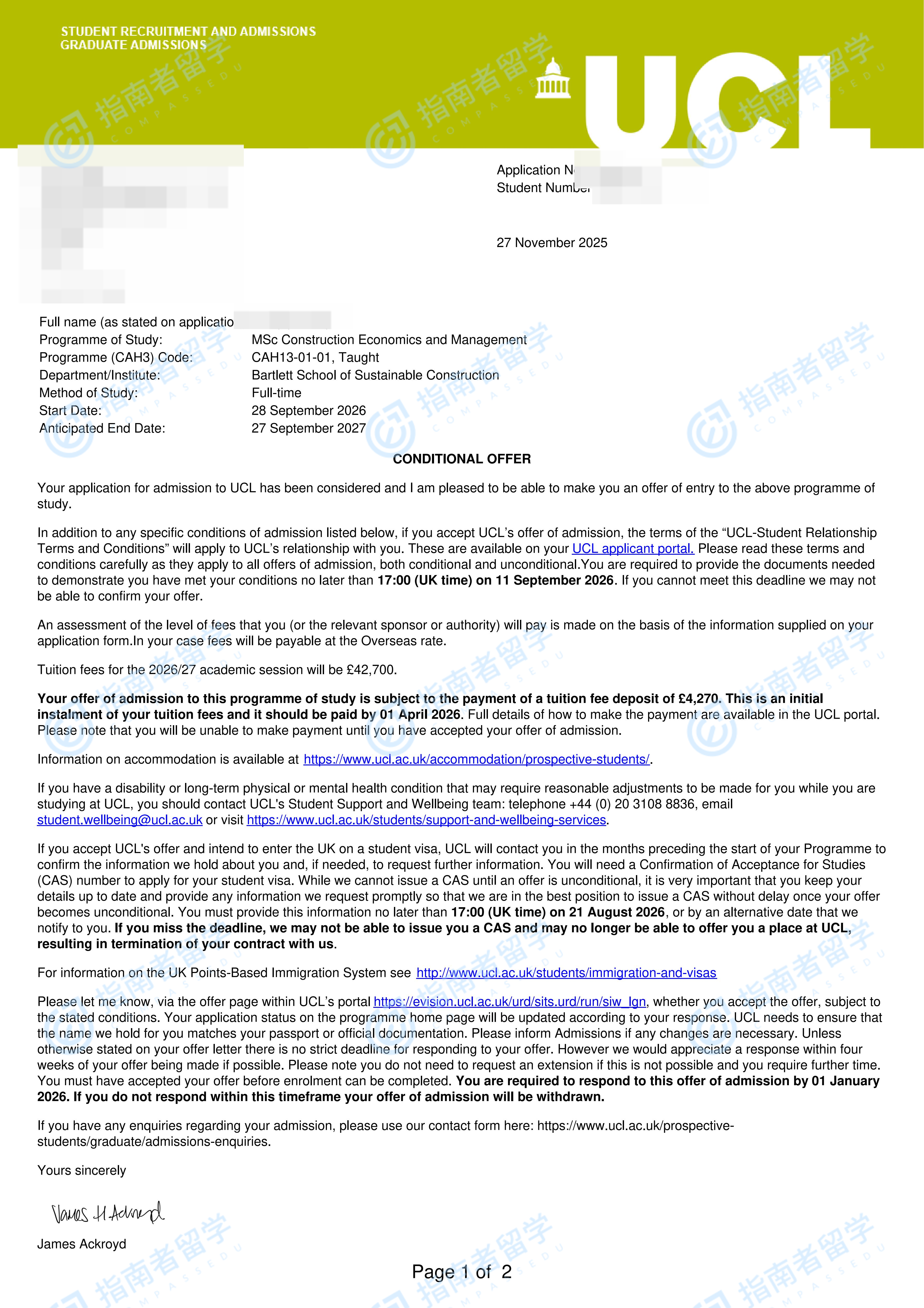 倫敦大學學院建筑經(jīng)濟與管理理學碩士研究生offer一枚
