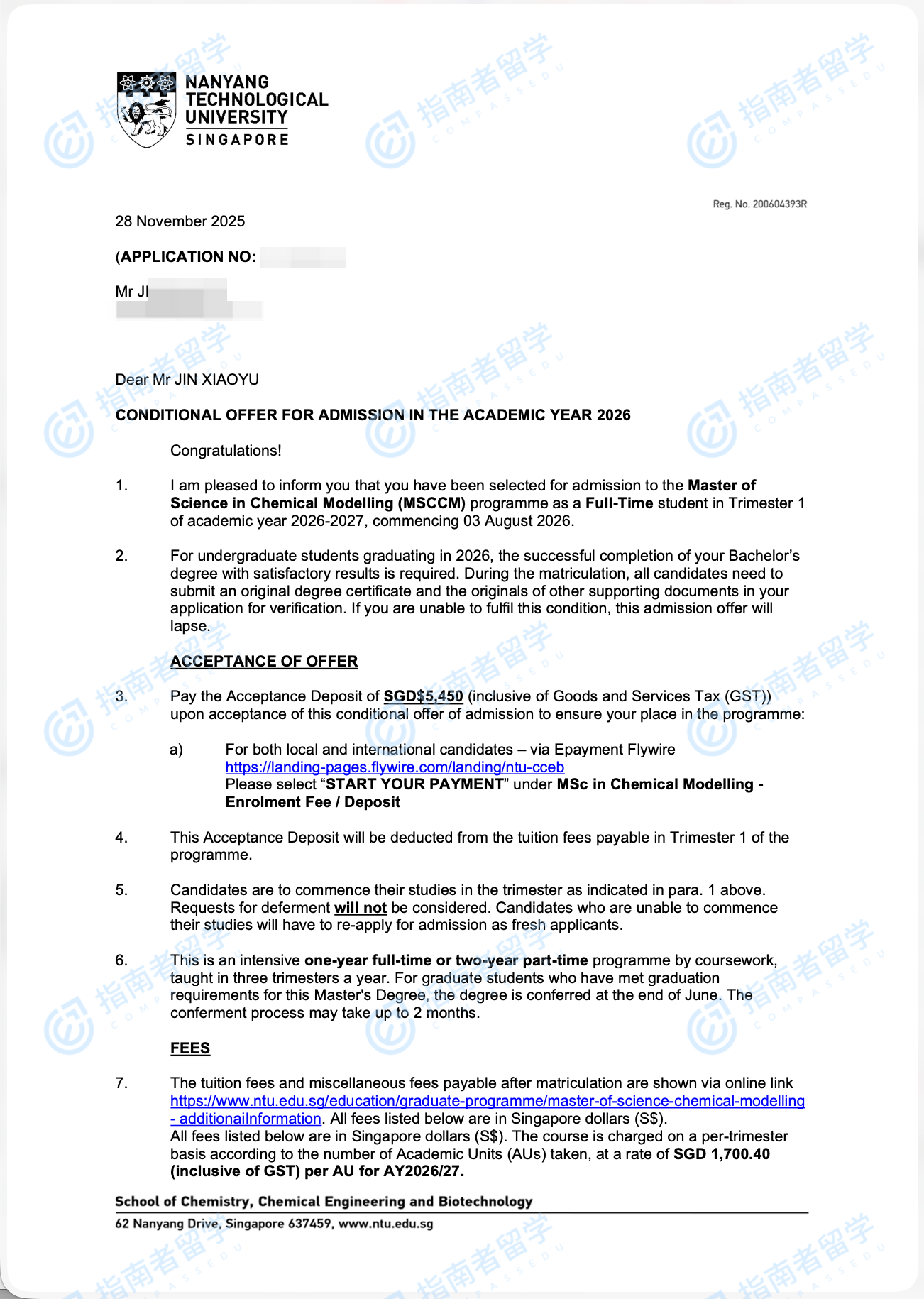 南洋理工大學(xué)化學(xué)建模理學(xué)碩士研究生offer一枚