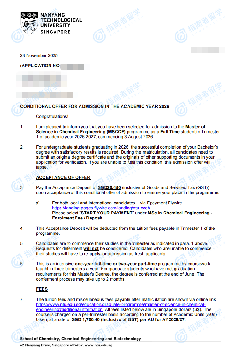 南洋理工大學化學工程理學碩士研究生offer一枚