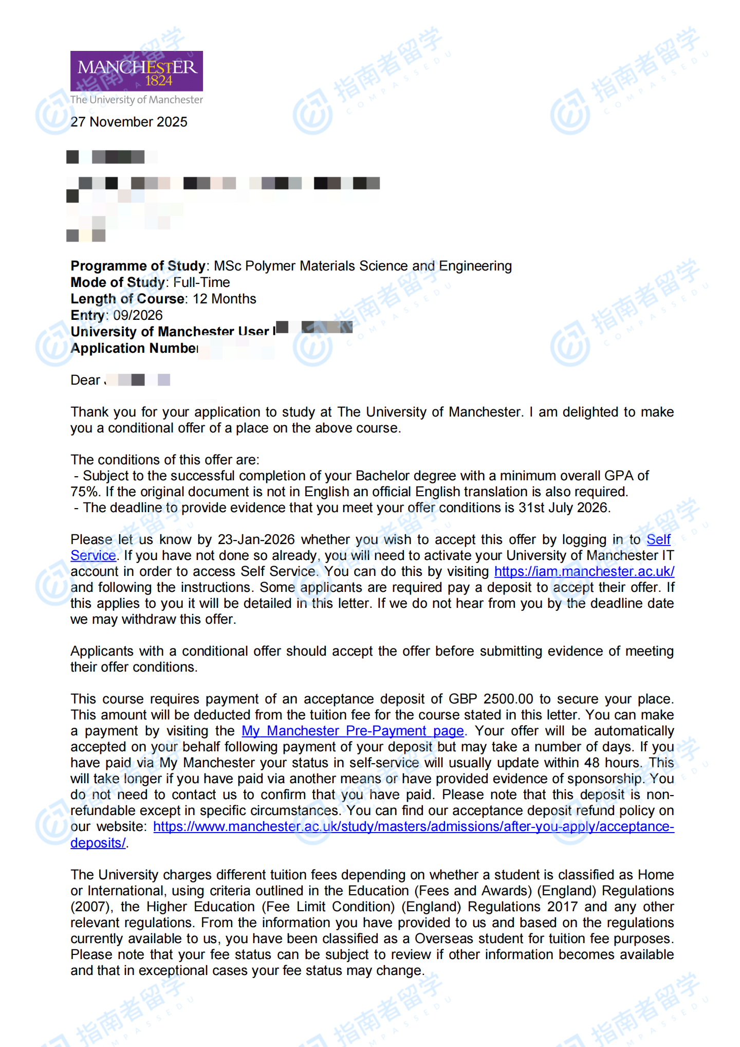 曼徹斯特大學(xué)高分子材料科學(xué)與工程理學(xué)碩士研究生offer一枚