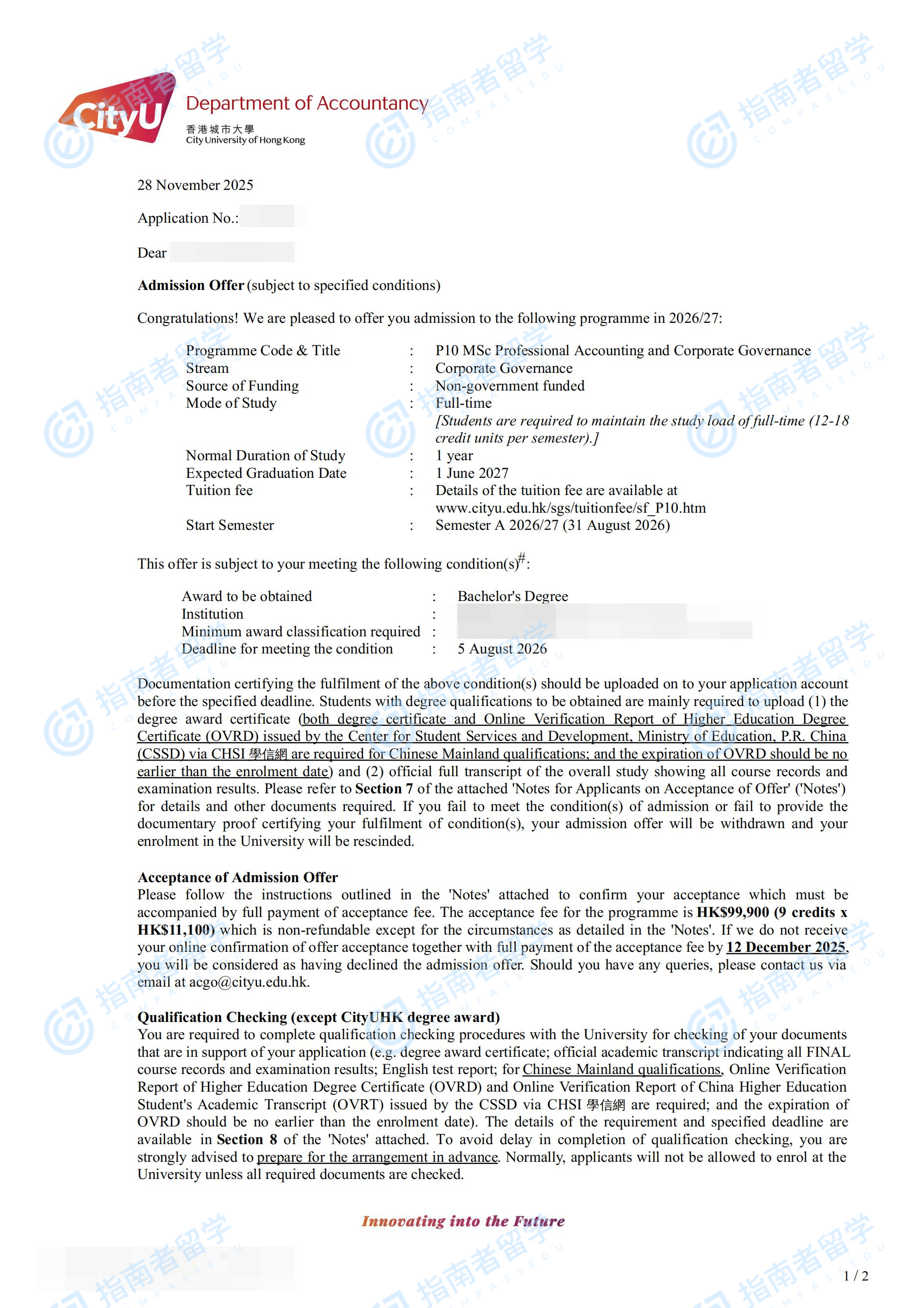 香港城市大學專業(yè)會計與企業(yè)管治理學碩士研究生offer一枚