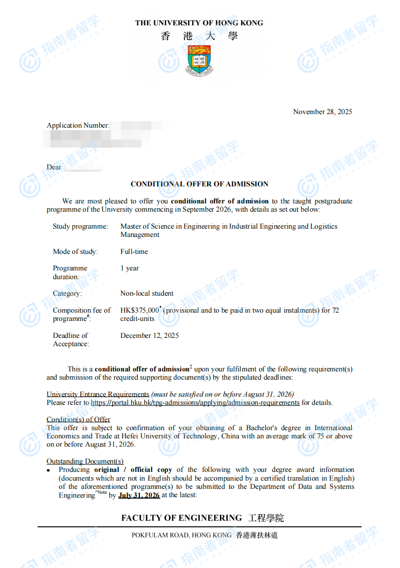 香港大學(xué)工業(yè)工程與物流管理(工程)理學(xué)碩士研究生offer一枚