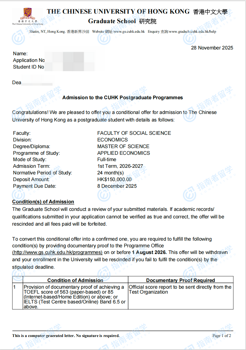 香港大學經(jīng)濟學碩士研究生offer一枚